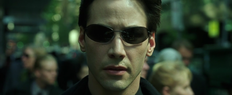 꿈에서 깨어나 AI에게 양육되고 있는 인간의 비참한 현실을 확인하고 매트릭스를 탈출한다. 자신에게 총을 겨누고 있는 경찰을.